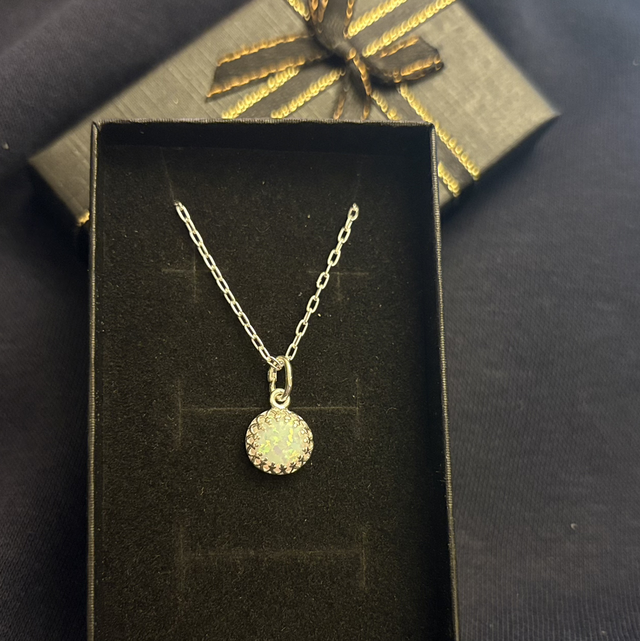 A shimmering 8mm white fire opal, lab-grown to perfection, glows with flashes of celestial color as it rests in a polished sterling silver setting. Suspended from a sleek sterling silver long cable link chain, this piece catches the light with every movement—soft, radiant, and effortlessly timeless.